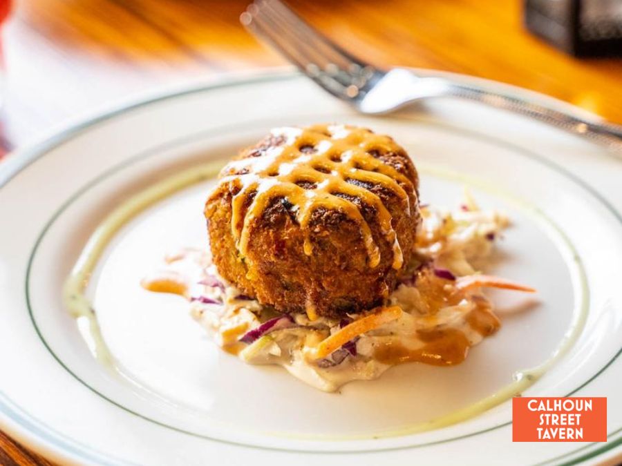 Calhoun Street Tavern feels like the kind of place you end up when you “just want one drink” and stay for three hours. It’s cozy, dimly lit, and packed with that easy Bluffton energy that makes everyone seem like a regular. Their crab cake fits right in — golden, meaty, and bold enough to stand on its own without a fancy garnish.