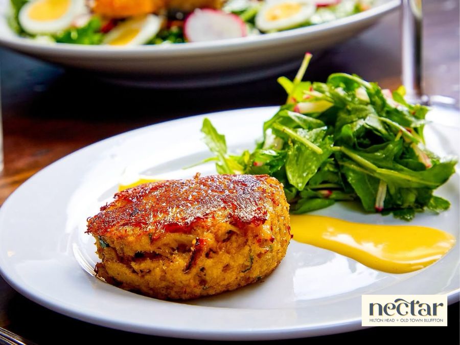 Nectar feels like walking into your favorite farmhouse that is bright, warm, and humming with good energy. Their crab cake dinner features two cakes, roasted veggies, mashed potatoes, and a remoulade that’s tangy enough to keep you on your toes. The crab is the star — chunky, sweet, and cooked just long enough to crisp the edges without drying out.