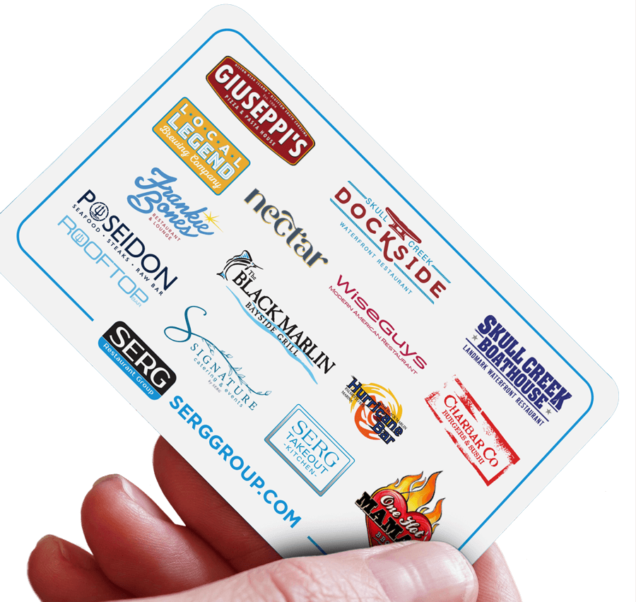 Offer available on traditional gift cards and e-gift cards; promo code not required. SERG Gift Cards are not considered cash and therefore are not applicable to the cash discount at the restaurants. Gift cards are not valid for use at Coastal Provisions, Skull Creek Boathouse General Store or Skull Creek Dockside Ship Store.